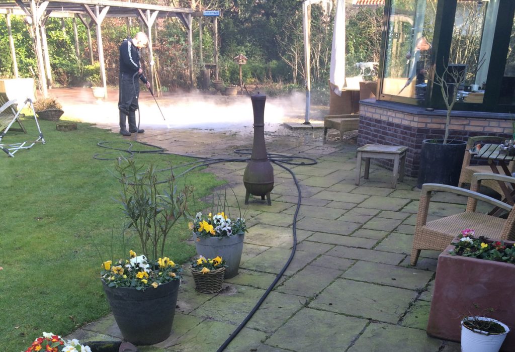 Zoals u hier kunt zien op de afbeeldingen hebben wij van De Jong Glas & Gevel in Wassenaar een gehele terrasreiniging gedaan. Hierbij hebben wij voornamelijk veel mos, gras, algen en groene aanslag weg laten halen door middel van onze professionele apparatuur.